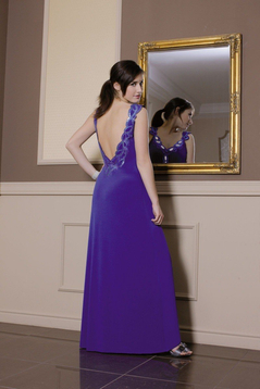 Długa sukienka, uszyta z bardzo elastycznej dzianiny o nazwie jersey. Z tyłu głęboki dekolt, eksponujący plecy, bogato ozdobiony licznymi cekinami oraz kamieniami, na przodzie dekolt również głęboki i bogato zdobiony. Talia na przodzie podkreślona cekinowym paskiem. Bez podszewki, bez zapięcia. Materiał użyty do uszycia sukienki nie ulega gnieceniu i mechaceniu. Polecamy głównie młodym dziewczynom, na wesela, przyjęcia urodzinowe, oraz wiele innych okazji.