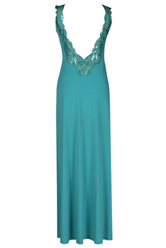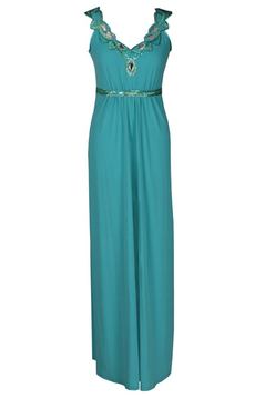 Długa sukienka, uszyta z bardzo elastycznej dzianiny o nazwie jersey. Z tyłu głęboki dekolt, eksponujący plecy, bogato ozdobiony licznymi cekinami oraz kamieniami, na przodzie dekolt również głęboki i bogato zdobiony. Talia na przodzie podkreślona cekinowym paskiem. Bez podszewki, bez zapięcia. Materiał użyty do uszycia sukienki nie ulega gnieceniu i mechaceniu. Polecamy głównie młodym dziewczynom, na wesela, przyjęcia urodzinowe, oraz wiele innych okazji.