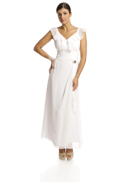 Zwiewna, szyfonowa, niezwykle elegancka długa sukienka. Głęboki dekolt, w kształcie serka, z doszytą miękko układającą się falbaną, eksponującą ramiona. Talia podkreślona drapowanym szerokim pasem. Poniżej dopinana broszka. Sukienka dopasowana jest w biuście oraz pasie, poniżej rozkloszowana, co pozwala zatuszować zbyt obfite kształty bioder oraz ud. Suwak kryty z tyłu. Sukienka wykończona podszewką. Sukienka przeznaczona jest dla kobiet w różnym wieku na wesela, studniówki, oraz inne uroczyste przyjęcia.