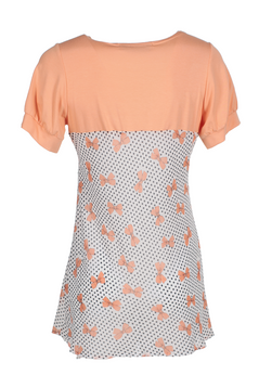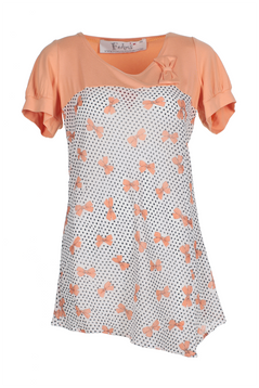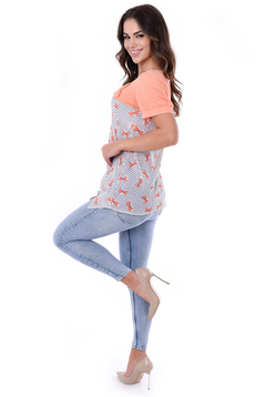 Tunika codzienna. Została uszyta z bardzo miłej w dotyku dzianiny oraz szyfonu. Jest luźna, dopasuje się do każdej figury. Dekolt okrągły. Rękaw - krótki, z mankietem o szerokości 3,5 cm. Dół przodu z lewej strony dłuższy, z pęknięciem. Tunika świetnie komponuje się w zestawieniu z legginsami lub spodniami z wąskimi nogawkami.