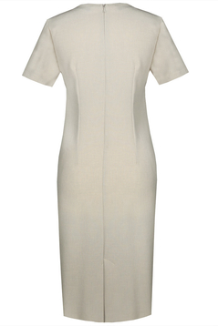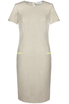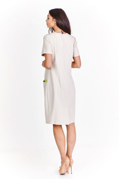 Klasyczna, prosta lekko taliowana sukienka. Dekolt półokrągły, wykończony lamówką. Rękaw krótki. Na przodzie cięcie modelujące biust, przechodzące w kieszeń. Kieszenie podkreślone kontrastowym akcentem. Zapinana na suwak kryty z tyłu, ułatwiający zakładanie, na dole rozporek pozwalający na swobodne chodzenie. Idealna na co dzień, do pracy imprezy w plenerze.