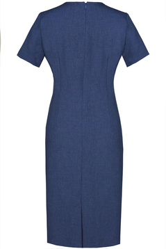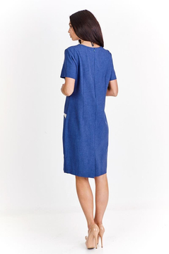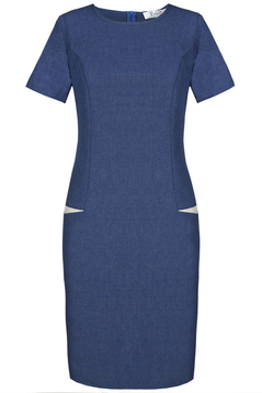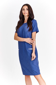 Klasyczna, prosta lekko taliowana sukienka. Dekolt półokrągły, wykończony lamówką. Rękaw krótki. Na przodzie cięcie modelujące biust, przechodzące w kieszeń. Kieszenie podkreślone kontrastowym akcentem. Zapinana na suwak kryty z tyłu, ułatwiający zakładanie, na dole rozporek pozwalający na swobodne chodzenie. Idealna  na co dzień, do pracy imprezy w plenerze.