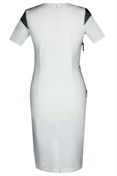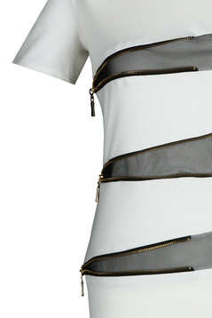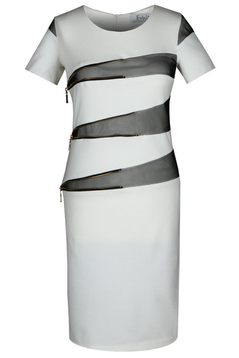 Asymetryczna sukienka. Linia dopasowana. Uszyta została z miłej w dotyku i przyjemnej dla ciała dzianiny. Dekolt okrągły. Rękaw krótki. Ozdobę stanowią wstawki na rękawach oraz w pasie. Są one uszyte z elastycznego tiulu. W pasie wstawki podkreślone metalowymi suwakami w kolorze złotym. Z tyłu suwak kryty oraz rozporek ułatwiający swobodne chodzenie. W pasie z tyłu zaszewki. Bez podszewki. Sukienka powstała z myślą o dziewczynach i kobietach w różnym wieku. Idealna na kameralne spotkania w gronie rodziny lub znajomych.