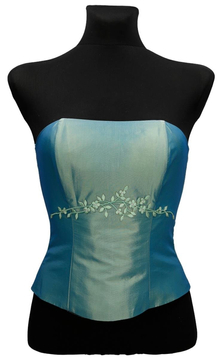Gorset z fiszbinami wiązany z tyłu, Gorsetem podkreślisz piękne ramiona i uwydatnisz biust, wiązaniem z tyłu dobrze go dopasujesz. Materiał - połyskująca tafta z kwiatowym haftem.  Dopasowana góra, podkreślona talia  to klasa i styl. Gorset uzupełni twoją garderobę, można nosić go zarówno do spodni jak i spódnic. Idealny  dla pań, które lubią podkreślić swoją sylwetkę.