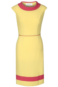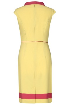 Klasyczna, dopasowana sukienka. Dekolt okrągły z efektownym kołnierzem. Na ramionach jest delikatna, wąska plisa. Z przodu i z tyłu cięcia francuskie. Talia podkreślona wypustką. Sukienka została uszyta z lekko elastycznej tkaniny, która nie ulega gnieceniu i mechaceniu. Bez podszewki. Z tyłu suwak kryty, oraz rozporek ułatwiający swobodne chodzenie. Sukienka przeznaczona jest dla kobiet w różnym wieku na uroczyste okazje, np. wesela, ale można ją nosić również na co dzień.