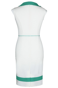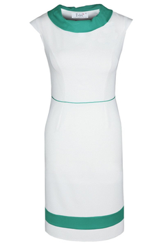 Klasyczna, dopasowana sukienka. Dekolt okrągły z efektownym kołnierzem. Na ramionach jest delikatna, wąska plisa. Z przodu i z tyłu cięcia francuskie. Talia podkreślona wypustką. Sukienka została uszyta z lekko elastycznej tkaniny, która nie ulega gnieceniu i mechaceniu. Bez podszewki. Z tyłu suwak kryty, oraz rozporek ułatwiający swobodne chodzenie. Sukienka przeznaczona jest dla kobiet w różnym wieku na uroczyste okazje, np. wesela, ale można ją nosić również na co dzień.