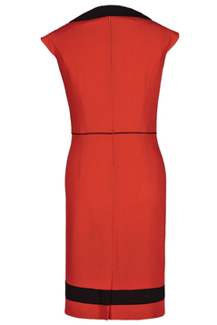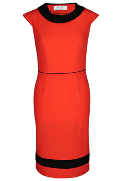 Klasyczna, dopasowana sukienka. Dekolt okrągły z efektownym kołnierzem. Na ramionach jest delikatna, wąska plisa. Z przodu i z tyłu cięcia francuskie. Talia podkreślona wypustką. Sukienka została uszyta z lekko elastycznej tkaniny, która nie ulega gnieceniu i mechaceniu. Bez podszewki. Z tyłu suwak kryty, oraz rozporek ułatwiający swobodne chodzenie. Sukienka przeznaczona jest dla kobiet w różnym wieku na uroczyste okazje, np. wesela, ale można ją nosić również na co dzień.