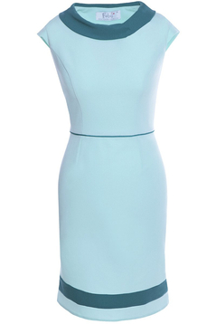 Klasyczna, dopasowana sukienka. Dekolt okrągły z efektownym kołnierzem. Na ramionach jest delikatna, wąska plisa. Z przodu i z tyłu cięcia francuskie. Talia podkreślona wypustką. Sukienka została uszyta z lekko elastycznej tkaniny, która nie ulega gnieceniu i mechaceniu. Bez podszewki. Z tyłu suwak kryty, oraz rozporek ułatwiający swobodne chodzenie. Sukienka przeznaczona jest dla kobiet w różnym wieku na uroczyste okazje, np. wesela, ale można ją nosić również na co dzień.