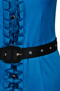 Prosta sukienka, z najwyższej jakości satyny bawełnianej. Przód sukienki to dekolt w kształcie caro. Rękawki wykończone malutkimi kontrafałdami. Cięcia francuskie przebiegające do linii bioder wysmuklają sylwetkę, a pasek w komplecie podkreśla talię. Sukienka od góry do samego dołu odpina się na małe guziczki, ukryte pod fantazyjnymi kontrafałdami. Dedykowana eleganckim kobietom, niezależnie od wieku. Idealna zarówno na komunię, imieniny, wesele jak i na mniej oficjalne wyjścia.