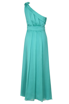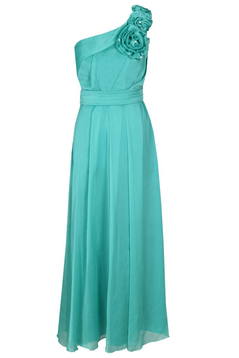 Asymetryczna, rozkloszowana, maxi sukienka, wzbudzająca podziw dosłownie wszystkich. Uszyta z dwutonowego szyfonu. Jest to niezwykle wyrafinowana tkanina. Przezroczysta, w dotyku bardzo delikatna, przypominająca szyfon jedwabny. Jest podszewka. Zakładana na jedno ramie, dołączone jest zapasowe cienkie ramiączko, które można doszyć do sukienki lub wykorzystać do biustonosza, zamiast niezbyt eleganckiego silikonowego. Talia zaakcentowana paskiem. Na przodzie i tyle zarówno na karczku jak i pod paskiem są szerokie miękko układające się zakładki. Charakteru dodają 3 bogate, różnej wielkości kwiaty, uszyte z tego samego materiału, dodatkowo ozdobione perełkami. Suwak kryty z boku. Jeśli chcesz zostać królową wieczoru, ta sukienka jest dla Ciebie. Polecamy na wesele, studniówkę lub Sylwestra.