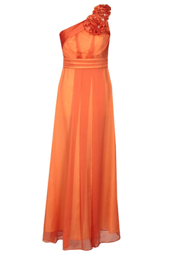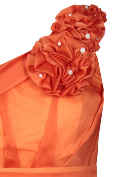 Asymetryczna, rozkloszowana, maxi sukienka, wzbudzająca podziw dosłownie wszystkich. Uszyta z dwutonowego szyfonu. Jest to niezwykle wyrafinowana tkanina. Przezroczysta, w dotyku bardzo delikatna, przypominająca szyfon jedwabny. Jest podszewka. Zakładana na jedno ramie, dołączone jest zapasowe cienkie ramiączko, które można doszyć do sukienki lub wykorzystać do biustonosza, zamiast niezbyt eleganckiego silikonowego. Talia zaakcentowana paskiem. Na przodzie i tyle zarówno na karczku jak i pod paskiem są szerokie miękko układające się zakładki. Charakteru dodają 3 bogate, różnej wielkości kwiaty, uszyte z tego samego materiału, dodatkowo ozdobione perełkami. Suwak kryty z boku. Jeśli chcesz zostać królową wieczoru, ta sukienka jest dla Ciebie. Polecamy na wesele, studniówkę lub Sylwestra.