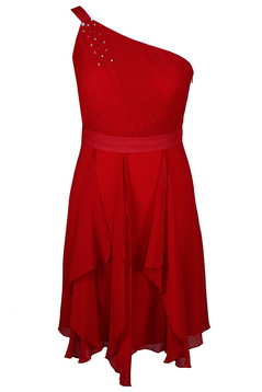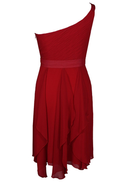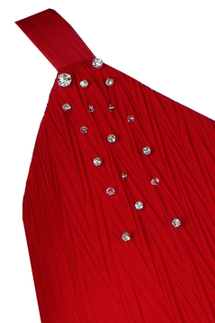 Lekka, zwiewna sukienka na podszewce. Wierzch sukienki- szyfon. Sukienka na jedno, ok. 2,5 cm ramiączko. Góra (na przodzie i tyle) fantazyjnie kreszowana. Z przodu, na wierzchu naszyta skromna ozdoba: cyrkonie oraz koraliki. Usztywniane miseczki. W talii pasek- wszyty w lewym boku. Od talii do samego dołu wszyte dodatkowe, szyfonowe falbany, obszyte mereżką, dodające zwiewności i lekkości (3  falbany z przodu i 3 z tyłu). Dół- mereżka, zapięcie- kryty suwak z boku. Sukienka idealna na wesela i inne imprezy okolicznościowe. Przezroczysty materiał oraz rozkloszowany dół, dodają lekkości i wdzięku.