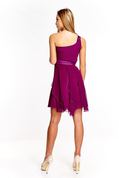 Lekka, zwiewna sukienka na podszewce. Wierzch sukienki- szyfon. Sukienka na jedno, ok. 2,5 cm ramiączko. Góra (na przodzie i tyle) fantazyjnie kreszowana. Z przodu, na wierzchu naszyta skromna ozdoba: cyrkonie oraz koraliki. Usztywniane miseczki. W talii pasek- wszyty w lewym boku. Od talii do samego dołu wszyte dodatkowe, szyfonowe falbany, obszyte mereżką, dodające zwiewności i lekkości (3  falbany z przodu i 3 z tyłu). Dół- mereżka, zapięcie- kryty suwak z boku. Sukienka idealna na wesela i inne imprezy okolicznościowe. Przezroczysty materiał oraz rozkloszowany dół, dodają lekkości i wdzięku.