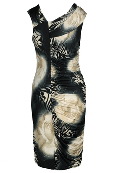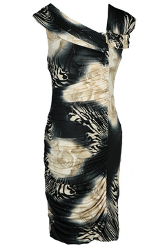 Dopasowana, seksowna sukienka uszyta z najwyższej jakości dzianiny. Asymetryczny dekolt, z boku przez całą długość przebiega fantazyjne drapowanie. Dostępna w wielu jednolitych kolorach, jak również w różnorodnych wzorach. Plecy częściowo odkryte, długość uniwersalna. Dzianina, którą użyto do uszycia sukienki jest bardzo elastyczna. Opina ciało, podkreślając kobiece kształty. Idealna na wesela, przyjęcia urodzinowe i wiele innych imprez. Szczególnie polecamy młodym kobietom.
