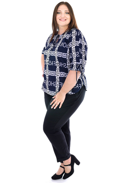 Elegancka bluzka wykończona z przodu ozdobnym rozcięciem i wiązaniem na sznureczki. Z tyłu jest zapięcie w kształcie łezki na guziczek z pętelką. Rękaw ¾ z wiązaniem tworzącym falbankę. Produkt ma asymetryczny krój - dół jest zaokrąglony a tył koszuli jest delikatnie dłuższy od przodu.
