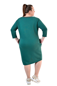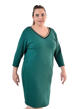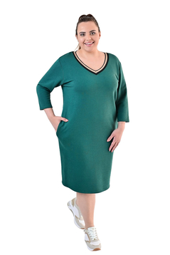 Prosta sukienka z lekko zaznaczoną talią. Doskonale tuszuje niedoskonałości sylwetki. Uszyta została z grubej, ciepłej dzianiny. Dekolt w  kształcie litery V wykończony  ozdobną taśmą.  Rękaw  ¾ . Dół lekko zwężony . Na biodrach funkcjonalne kieszenie. Rękawy długości 3/4.  Bez suwaka, bez podszewki. Sukienka  idealna na zimowe i chłodne dni. Polecamy kobietom w każdym wieku, idealna na co dzień do pracy.