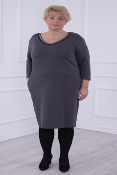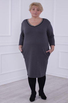 Prosta sukienka z lekko zaznaczoną talią. Doskonale tuszuje niedoskonałości sylwetki. Uszyta została z grubej, ciepłej dzianiny. Dekolt w kształcie litery V wykończony ozdobną taśmą. Rękaw ¾ . Dół lekko zwężony . Na biodrach funkcjonalne kieszenie. Rękawy długości 3/4. Bez suwaka, bez podszewki. Sukienka idealna na zimowe i chłodne dni. Polecamy kobietom w każdym wieku, idealna na co dzień do pracy.