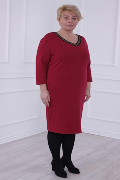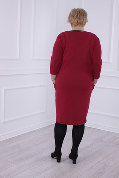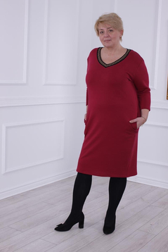 Prosta sukienka z lekko zaznaczoną talią. Doskonale tuszuje niedoskonałości sylwetki. Uszyta została z grubej, ciepłej dzianiny. Dekolt w kształcie litery V wykończony ozdobną taśmą. Rękaw ¾ . Dół lekko zwężony . Na biodrach funkcjonalne kieszenie. Rękawy długości 3/4. Bez suwaka, bez podszewki. Sukienka idealna na zimowe i chłodne dni. Polecamy kobietom w każdym wieku, idealna na co dzień do pracy.