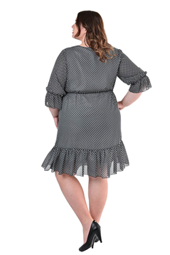 Na dole sukienki szeroka falbana. Rękawy oraz dół  wykończony  mereżką.