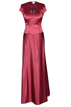Szykuje się jakaś wyjątkowa impreza, bal karnawałowy a może wieczór panieński w określonej atmosferze? Długa suknia z satyny gładkiej lekko połyskującej. Bardzo elegancka. Dopasowana góra, gorset wiązany pięknie podkreśli szczupłą talię. Ramiona odkryte. Bolerko w zestawie.