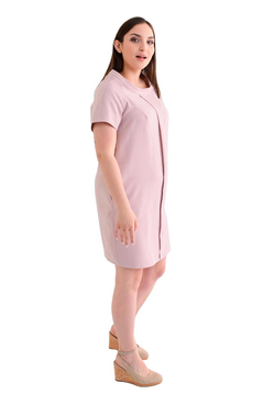 Sukienka, wykonana z lnu z domieszką poliestru, zapewnia oddychanie ciału, przewiewność i będzie fantastyczna na upalny czas. Nie będzie się też gniotła, dzięki czemu zapewni nieskazitelny wygląd przez cały dzień. Krój minimalistyczny, zbliżony do ołówkowego, długość przed kolano, krótki rękaw, dekolt w łódkę – całość jednak została uzupełniona o plisę, która przechodzi pionowo przez środek sukienki. Podkreśla linię biustu, brzucha, aż do kolan, czyniąc sukienkę wyrafinowaną. Subtelny akcent skupia uwagę, dzięki czemu drobne mankamenty figury schodzą na drugi plan. Zestawienie sukienki z sandałkami na obcasie pozwoli uzyskać oszałamiający efekt, nie sposób nie zwrócić wówczas na siebie uwagi.