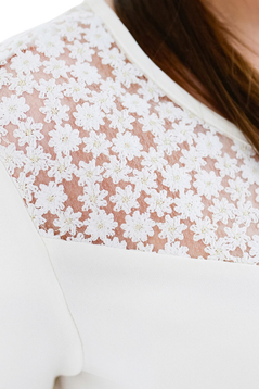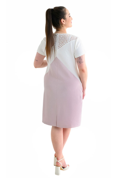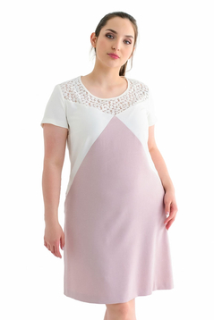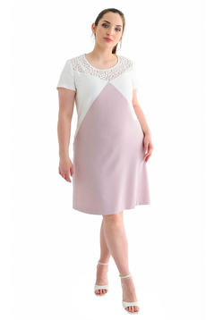 Prosty krój, delikatni rozkloszowany ku dołowi. Rękaw krótki. Dekolt ozdobiony ażurową koronką. Dwukolor. Kieszenie na biodrach.