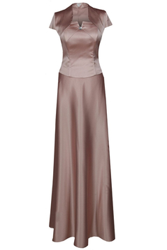 Szykuje się jakaś wyjątkowa impreza, bal karnawałowy a może wieczór panieński w określonej atmosferze? Długa suknia z satyny gładkiej lekko połyskującej. Bardzo elegancka. Dopasowana góra, gorset wiązany pięknie podkreśli szczupłą talię. Ramiona odkryte. Bolerko w zestawie.