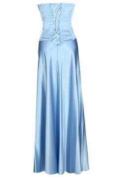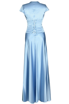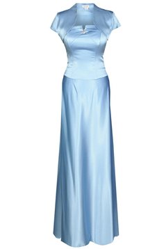 Szykuje się jakaś wyjątkowa impreza, bal karnawałowy a może wieczór panieński w określonej atmosferze? Długa suknia z satyny gładkiej lekko połyskującej. Bardzo elegancka. Dopasowana góra, gorset wiązany pięknie podkreśli szczupłą talię. Ramiona odkryte. Bolerko w zestawie.