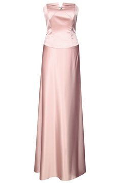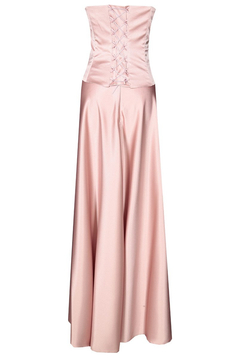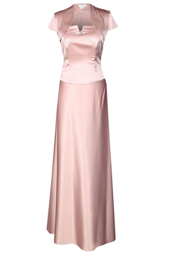 Szykuje się jakaś wyjątkowa impreza, bal karnawałowy a może wieczór panieński w określonej atmosferze? Długa suknia z satyny gładkiej lekko połyskującej. Bardzo elegancka. Dopasowana góra, gorset wiązany pięknie podkreśli szczupłą talię. Ramiona odkryte. Bolerko w zestawie.