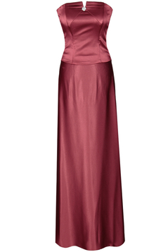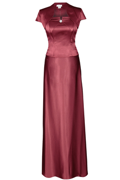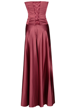Szykuje się jakaś wyjątkowa impreza, bal karnawałowy a może wieczór panieński w określonej atmosferze? Długa suknia z satyny gładkiej lekko połyskującej. Bardzo elegancka. Dopasowana góra, gorset wiązany pięknie podkreśli szczupłą talię. Ramiona odkryte. Bolerko w zestawie.