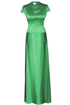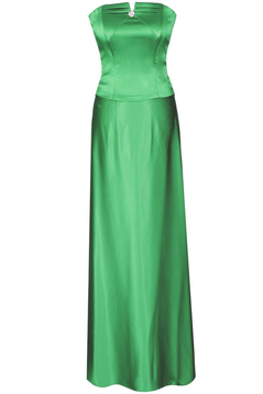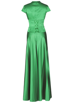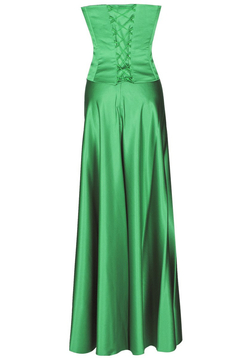 Szykuje się jakaś wyjątkowa impreza, bal karnawałowy a może wieczór panieński w określonej atmosferze? Długa suknia z satyny gładkiej lekko połyskującej. Bardzo elegancka. Dopasowana góra, gorset wiązany pięknie podkreśli szczupłą talię. Ramiona odkryte. Bolerko w zestawie.