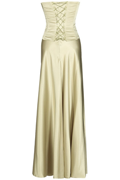 Szykuje się jakaś wyjątkowa impreza, bal karnawałowy a może wieczór panieński w określonej atmosferze? Długa suknia z satyny gładkiej lekko połyskującej. Bardzo elegancka. Dopasowana góra, gorset wiązany pięknie podkreśli szczupłą talię. Ramiona odkryte. Bolerko w zestawie.