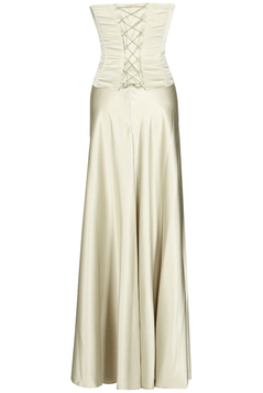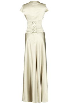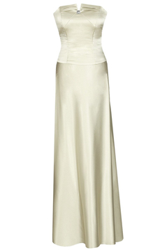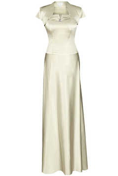 Szykuje się jakaś wyjątkowa impreza, bal karnawałowy a może wieczór panieński w określonej atmosferze? Długa suknia z satyny gładkiej lekko połyskującej. Bardzo elegancka. Dopasowana góra, gorset wiązany pięknie podkreśli szczupłą talię. Ramiona odkryte. Bolerko w zestawie.