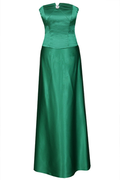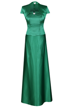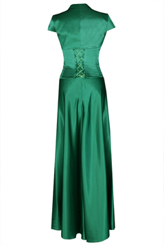 Szykuje się jakaś wyjątkowa impreza, bal karnawałowy a może wieczór panieński w określonej atmosferze? Długa suknia z satyny gładkiej lekko połyskującej. Bardzo elegancka. Dopasowana góra, gorset wiązany pięknie podkreśli szczupłą talię. Ramiona odkryte. Bolerko w zestawie.