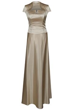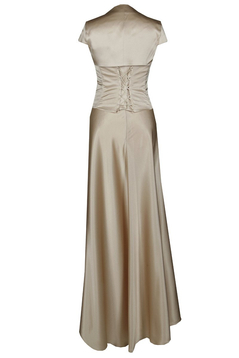 Szykuje się jakaś wyjątkowa impreza, bal karnawałowy a może wieczór panieński w określonej atmosferze? Długa suknia z satyny gładkiej lekko połyskującej. Bardzo elegancka. Dopasowana góra, gorset wiązany pięknie podkreśli szczupłą talię. Ramiona odkryte. Bolerko w zestawie.