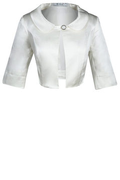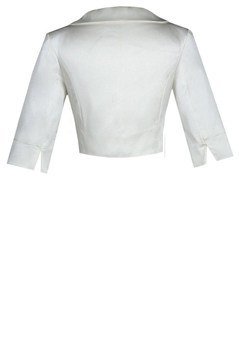 Żakiet wizytowy. Dekolt okrągły, wykończony kołnierzem. Zapinany na jeden ozdobny guzik. Rękaw 3/4, z małym pęknięciem oraz wywijanym mankietem. Żakiet kończy się w okolicy pasa. Uszyty został z gładkiej, eleganckiej tkaniny. Jest podszewka. Idealnie pasuje do wizytowych sukienek, jako uzupełnienie stylizacji.