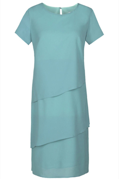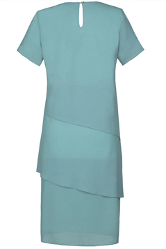Sukienka została uszyta z cienkiego zwiewnego materiału. Jest wykończona podszewką. Dekolt okrągły. Sukieneczka zapinana jest z tyłu na mały guziczek. Skośne falbany zarówno z przodu jak i z tyłu optycznie wyszczuplają sylwetkę. Rękaw krótki. Sukienka jest luźna, nie posiada suwaka. Sukienka idealna na uroczyste spotkania w gronie rodziny i przyjaciół.