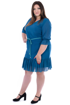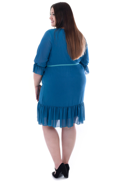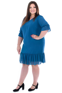Na dole sukienki szeroka falbana. Rękawy oraz dół  wykończony  mereżką.