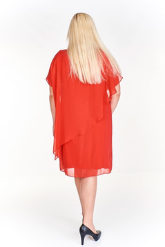 Asymetryczna, luźna sukienka. Dół delikatnie poszerzany. Dekolt okrągły. Rękaw krótki. Wierzchnia warstwa szyfonu, zarówno z przodu jak i z tyłu przebiega po skosie. Optycznie wyszczupla sylwetkę. Maskuje niedoskonałości figury. Uszyta została głównie z szyfonu i wiskozy. Warstwa dotykająca do ciała, to miła w dotyku, przepuszczająca powietrze dzianina. Skład surowcowy: poliester 50%, wiskoza 41%, elastan 9%. Sukienka nie posiada suwaka, ponieważ jest wystarczająco luźna. Idealna na rodzinne uroczystości, np. wesela, komunie. Przy odpowiedniej stylizacji, sukieneczkę można również zestawić w mniej oficjalnych, ubiorach codziennych.