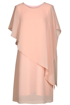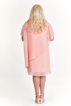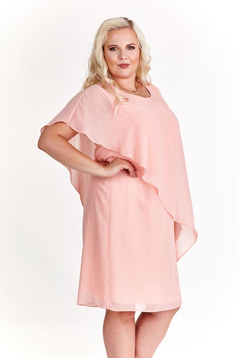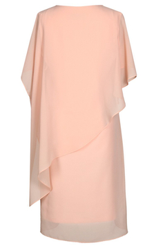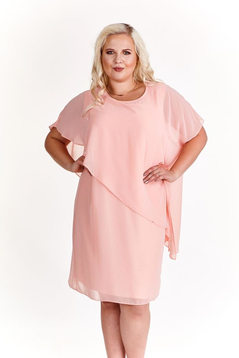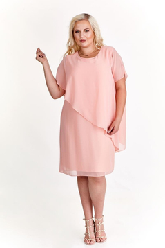 Asymetryczna, luźna sukienka. Dół delikatnie poszerzany. Dekolt okrągły. Rękaw krótki. Wierzchnia warstwa szyfonu, zarówno z przodu jak i z tyłu przebiega po skosie. Optycznie wyszczupla sylwetkę. Maskuje niedoskonałości figury. Uszyta została głównie z szyfonu i wiskozy. Warstwa dotykająca do ciała, to miła w dotyku, przepuszczająca powietrze dzianina. Skład surowcowy: poliester 50%, wiskoza 41%, elastan 9%. Sukienka nie posiada suwaka, ponieważ jest wystarczająco luźna. Idealna na rodzinne uroczystości, np. wesela, komunie. Przy odpowiedniej stylizacji, sukieneczkę można również zestawić w mniej oficjalnych, ubiorach codziennych.