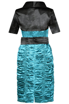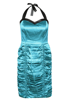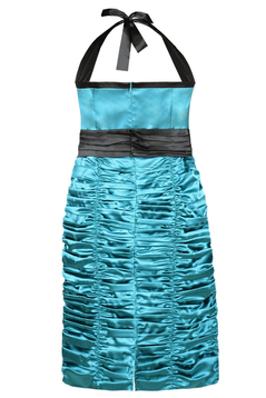 Wizytowa sukienka. Model uszyty został z satyny. Jest to delikatnie elastyczna tkanina z połyskiem. Bardzo miła w dotyku. Zawiązywana na szyi. Dekolt sercowe karo. Sukienka jest dopasowana. Odcięta w talii. Pasek zapinany na małe guziczki. Dół bardzo marszczony, tworzą się poziome fale. Z tyłu suwak kryty, oraz niewielkie pęknięcie ułatwiające chodzenie. W komplecie brak bolerka. Sukieneczka idealna na różnego rodzaju uroczyste wyjścia, np. wesela, komunie i wiele innych okazji.