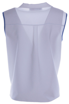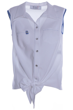 Lekka, letnia bluzka bez rękawów, z kołnierzykiem. Przód: zapięcie na guziki, dwie kieszonki. Na dole wiązanie. Z przodu mało widoczne zaszewki piersiowe, dodatkowe cięcia poniżej ramion. Z tyłu karczek, zakładka. Ramiona wykończone kontrastową lamówką, niektóre przeszycia w tym samym, kontrastowym kolorze. Na jednej z kieszonek mała ozdoba: guzik naszyty na tasiemkę. Bluzka idealnie komponuje się z dżinsami, ale będzie wyglądać efektownie, również w innych zestawach.
