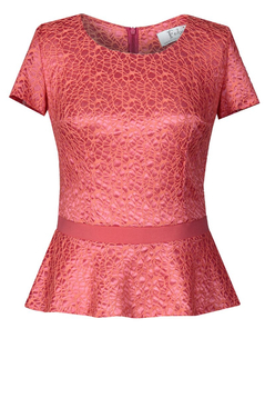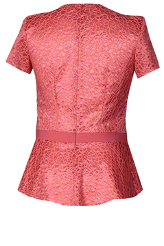 Elegancka bluzka z krótkim rękawem, baskinką oraz wszytym paskiem z innego, kolorystycznie dobranego materiału. Z przodu standardowe zaszewki. Wzór na materiale przypomina naszywane sznureczki. Z tyłu zapięcie na kryty suwak oraz zaszewki. Elegancki i kobiecy krój oraz ciekawa kolorystyka sprawia, że kobieta w każdym wieku wygląda w niej modnie i atrakcyjnie. Bluzka świetnie komponuje się z różnego rodzaju elementami garderoby i każdej stylizacji będzie nadawać oryginalności. Do kompletu szczególnie polecamy spódnicę: FSP622. Jest ona wykonana z tego samego materiału, z którego pasek w bluzce, dlatego też, będą razem idealnym zestawem.