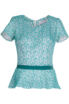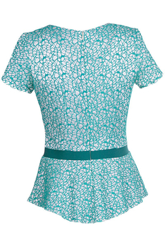 Elegancka bluzka z krótkim rękawem, baskinką oraz wszytym paskiem z innego, kolorystycznie dobranego materiału. Z przodu standardowe zaszewki. Wzór na materiale przypomina naszywane sznureczki. Z tyłu zapięcie na kryty suwak oraz zaszewki. Elegancki i kobiecy krój oraz ciekawa kolorystyka sprawia, że kobieta w każdym wieku wygląda w niej modnie i atrakcyjnie. Bluzka świetnie komponuje się z różnego rodzaju elementami garderoby i każdej stylizacji będzie nadawać oryginalności. Do kompletu szczególnie polecamy spódnicę: FSP622. Jest ona wykonana z tego samego materiału, z którego pasek w bluzce, dlatego też, będą razem idealnym zestawem.