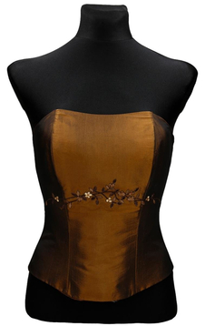 Gorset z fiszbinami wiązany z tyłu, Gorsetem podkreślisz piękne ramiona i uwydatnisz biust, wiązaniem z tyłu dobrze go dopasujesz. Materiał - połyskująca tafta z kwiatowym haftem.  Dopasowana góra, podkreślona talia  to klasa i styl. Gorset uzupełni twoją garderobę, można nosić go zarówno do spodni jak i spódnic. Idealny  dla pań, które lubią podkreślić swoją sylwetkę.