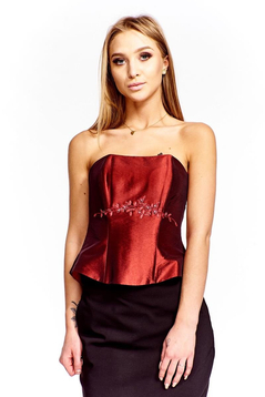 Gorset z fiszbinami wiązany z tyłu, Gorsetem podkreślisz piękne ramiona i uwydatnisz biust, wiązaniem z tyłu dobrze go dopasujesz. Materiał - połyskująca tafta z kwiatowym haftem.  Dopasowana góra, podkreślona talia  to klasa i styl. Gorset uzupełni twoją garderobę, można nosić go zarówno do spodni jak i spódnic. Idealny  dla pań, które lubią podkreślić swoją sylwetkę.