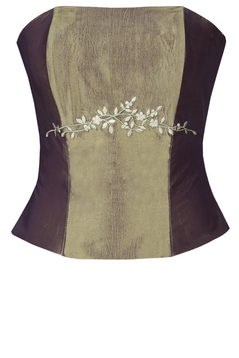 Gorset z fiszbinami wiązany z tyłu, Gorsetem podkreślisz piękne ramiona i uwydatnisz biust, wiązaniem z tyłu dobrze go dopasujesz. Materiał - połyskująca tafta z kwiatowym haftem.  Dopasowana góra, podkreślona talia  to klasa i styl. Gorset uzupełni twoją garderobę, można nosić go zarówno do spodni jak i spódnic. Idealny  dla pań, które lubią podkreślić swoją sylwetkę.
