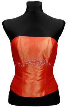 Gorset z fiszbinami wiązany z tyłu, Gorsetem podkreślisz piękne ramiona i uwydatnisz biust, wiązaniem z tyłu dobrze go dopasujesz. Materiał - połyskująca tafta z kwiatowym haftem.  Dopasowana góra, podkreślona talia  to klasa i styl. Gorset uzupełni twoją garderobę, można nosić go zarówno do spodni jak i spódnic. Idealny  dla pań, które lubią podkreślić swoją sylwetkę.