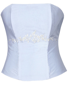 Gorset z fiszbinami wiązany z tyłu, Gorsetem podkreślisz piękne ramiona i uwydatnisz biust, wiązaniem z tyłu dobrze go dopasujesz. Materiał - połyskująca tafta z kwiatowym haftem.  Dopasowana góra, podkreślona talia  to klasa i styl. Gorset uzupełni twoją garderobę, można nosić go zarówno do spodni jak i spódnic. Idealny  dla pań, które lubią podkreślić swoją sylwetkę.