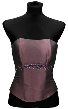 Gorset z fiszbinami wiązany z tyłu, Gorsetem podkreślisz piękne ramiona i uwydatnisz biust, wiązaniem z tyłu dobrze go dopasujesz. Materiał - połyskująca tafta z kwiatowym haftem.  Dopasowana góra, podkreślona talia  to klasa i styl. Gorset uzupełni twoją garderobę, można nosić go zarówno do spodni jak i spódnic. Idealny  dla pań, które lubią podkreślić swoją sylwetkę.